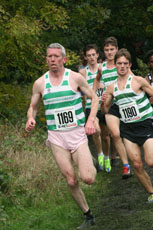 Highgate Harriers had closed 6 men before our 4th man, Kevin Murphy, crossed the line in 22nd. But that sparked a rush in which we had 7 more finishers inside 36. Teacher Murphy was delighted with his result, due mainly to a good bank of training accumulated during the school holidays. 1.49 800m man Jordan Donnelly had flown back from Germany to take advantage of the UK's more competitive racing scene and was satisfied with 23rd after a stressful week at his job at Puma. And Angus Holford (24) showed signs that he could have a very good winter as he ran very well for 24th.