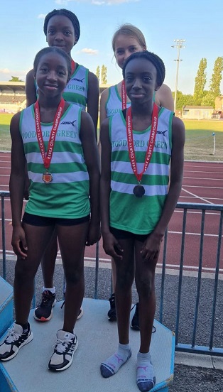 In the u/13 girls 4x100m (Evanna Eze, Remi Salako, Isabella Moulton & Annabel Reid) had a couple of changes leading up to the event, but they didn't let this faze them at all, and they were delighted to finish 2nd with a time of 54.9sec and win SILVER.