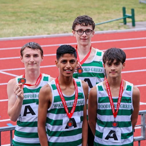 The other two races were the U 15 4 x 300m with Woodford represented in both. The U/15 Girls (Evie Mosanya, Mame-Nhyria Coleman, Eliza Bridges & Daisy Coleman) came home in a very creditable 3rd place for bronze medals in a time of 3m 03.66sec.