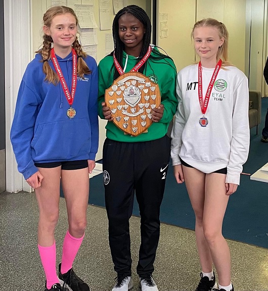 Having already annexed the National Indoor U15 Shot Put title earlier this year Rebecca made a solid start in the first discipline, the long jump, with 4.61 which left her third overall. The next two events would see Rebecca take a commanding lead as she won the 75 metre hurdles in 11.88 before winning the Shot with 11.02 metres. Rebecca is ranked top 3 for both of these events in the UK for U15 girls. So the afternoon started with the High Jump in very blustery conditions - not ideal for this discipline. Rebecca jumped 1.35 metres to be 6th in this event but still held into her overall lead. This is something that her coach will need to address going forward if she is to get the top level in this event. The final discipline was the 800m, and Rebecca ran the perfect race to come off the final bend and sprint to a good win in her race for another PB of 2 minutes 41 seconds which placed her second in this event to maintain her overall lead and win the county title by over 150 points.