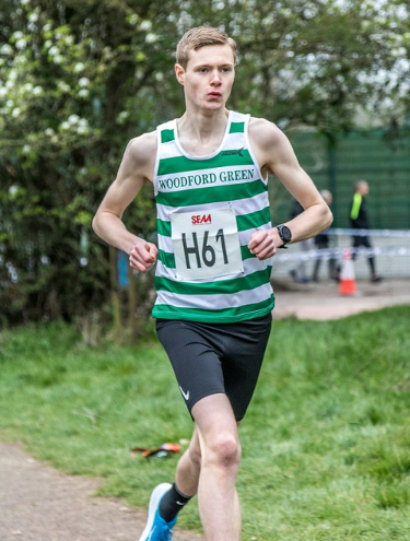 Angus Holford was pleased to go one place better than last year with his 13th place. Having started conservatively he spent most of the first lap reeling in his Colchester training partners Ram Osman and Tom Rehal. Having done so, he was kept honest by their refusal to ever be completely dropped, and managed to overhaul one more runner in the home straight. Tom Beedell had had an injury scare in the preceding week. With the team prize potentially on the line, captain Tom judged this to have healed enough for him to start and to take a similarly conservative approach, to carry him to 23rd place. Tom enjoyed being able to survey the field as the race proceeded and see that Woodford were on course for the team title. He was followed by Dan Steel. Unusually, Dan has no spring marathons planned, so he is free to run cross country on un-tired legs, and this told with his 28th place, 5 places up from this time last year.